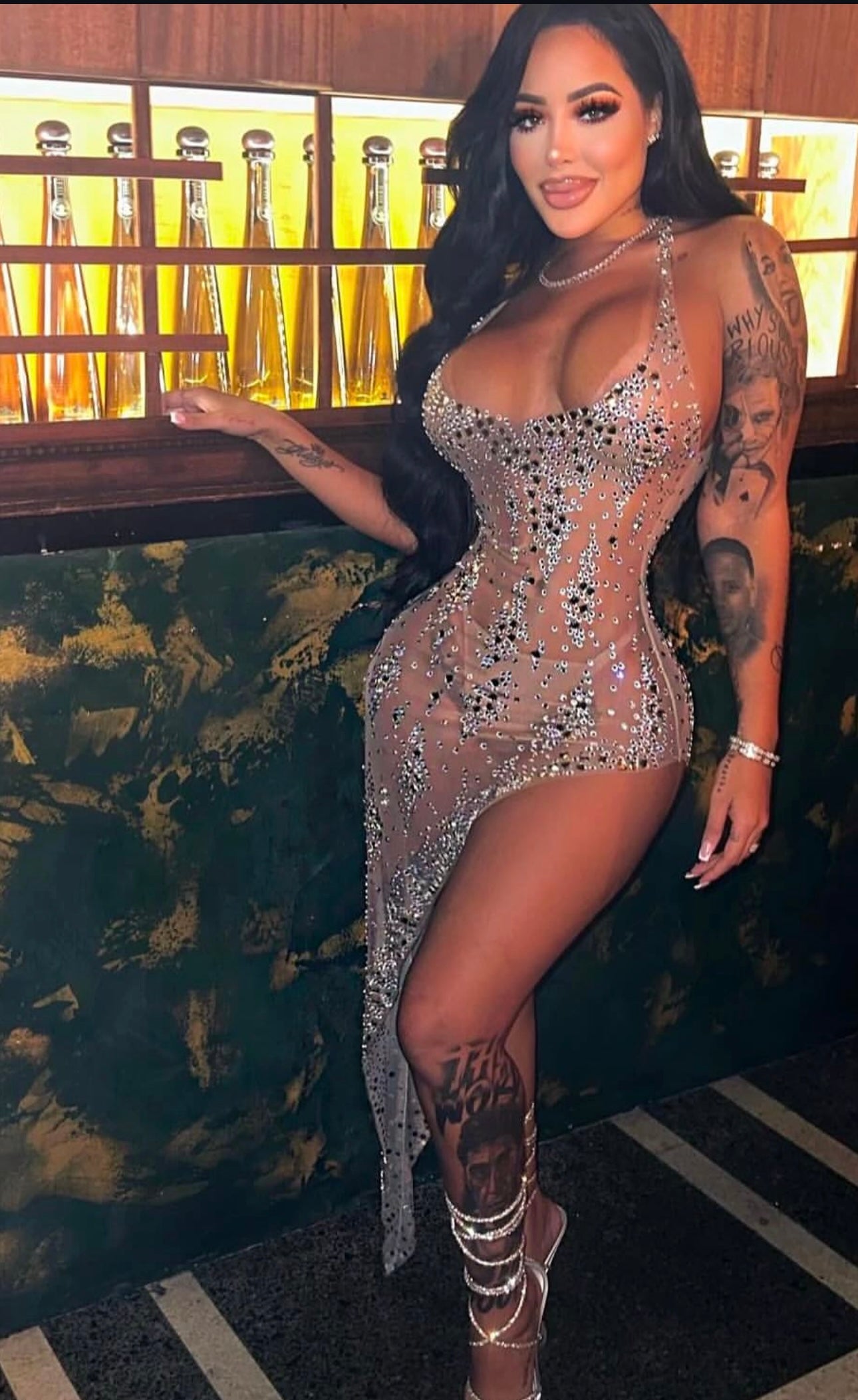 Elegant and transparent, this silver sparkle dress is adorned with shimmering silver and crystal rhinestones. Featuring a sleek zipper at the back for a perfect fit.