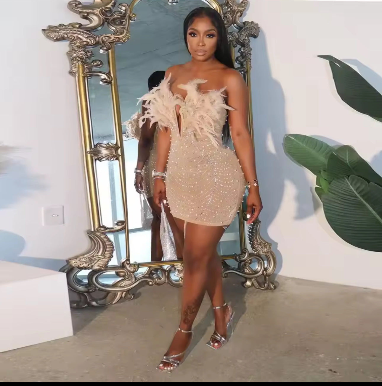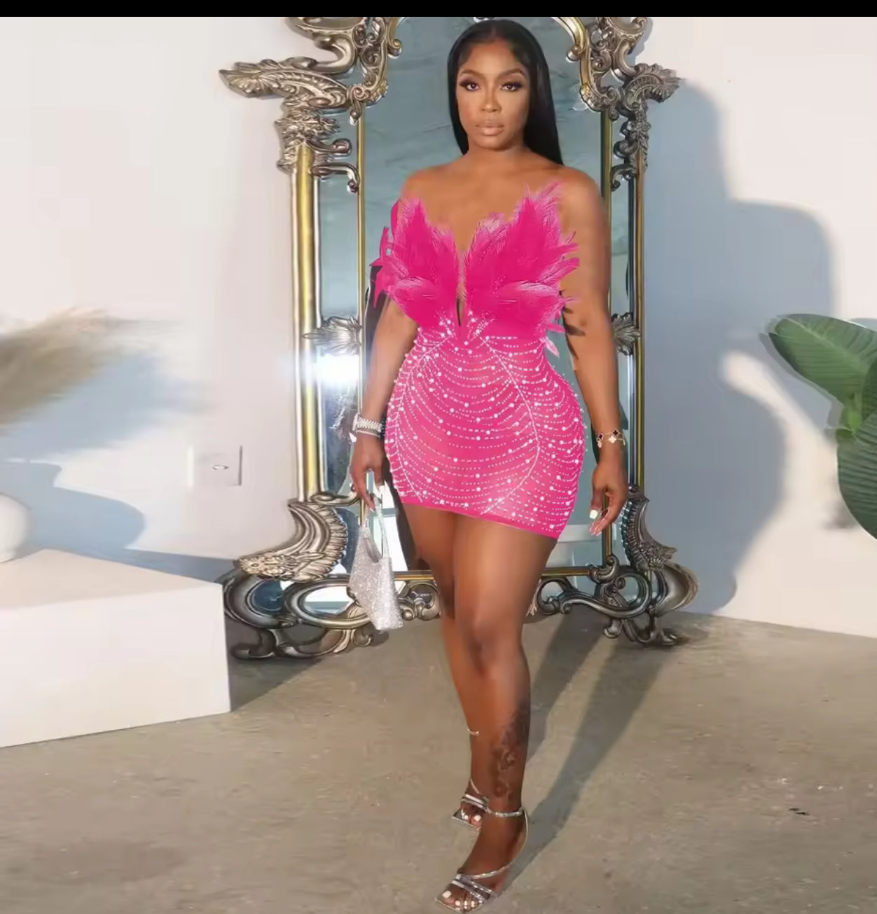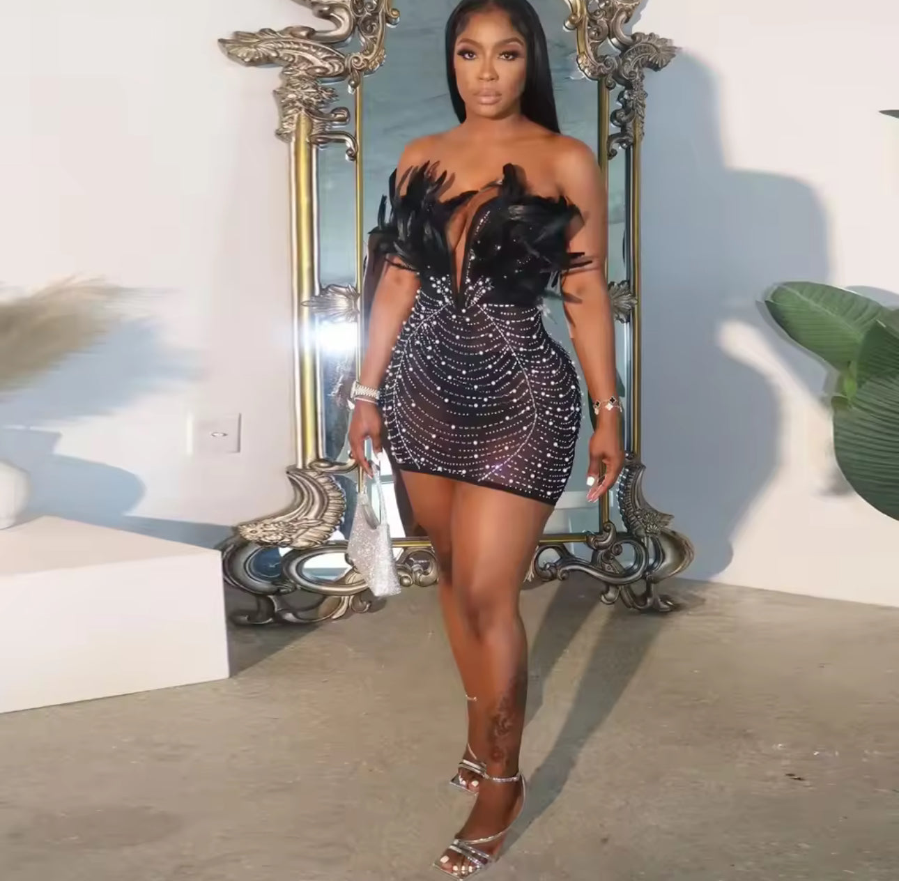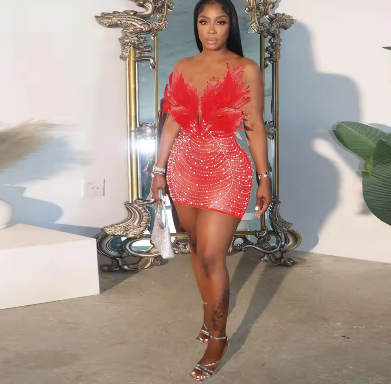 Women Diamonds Hot Rhinestones Feather Mesh Dress